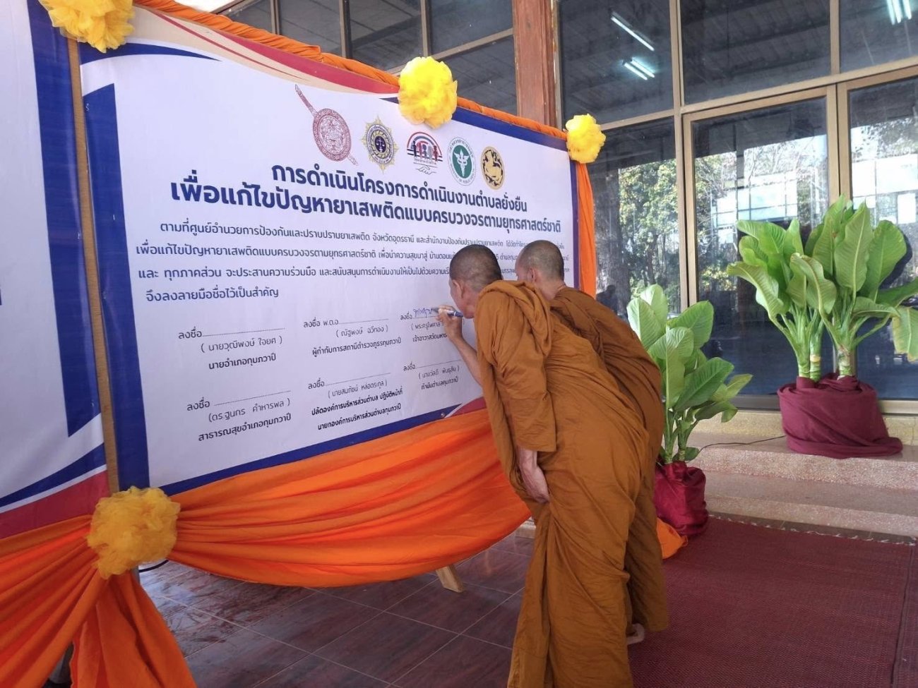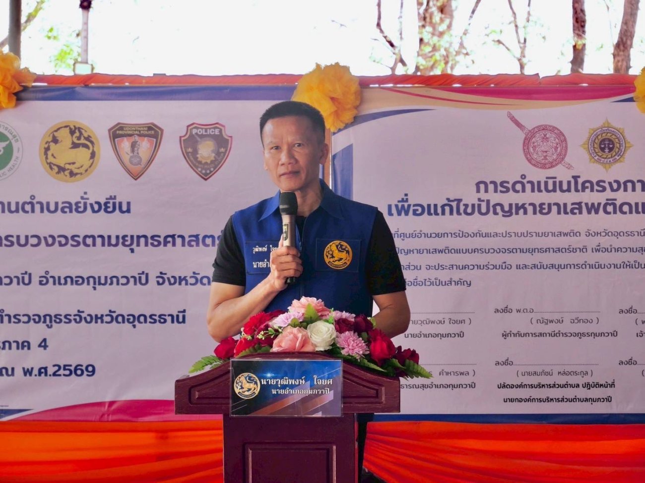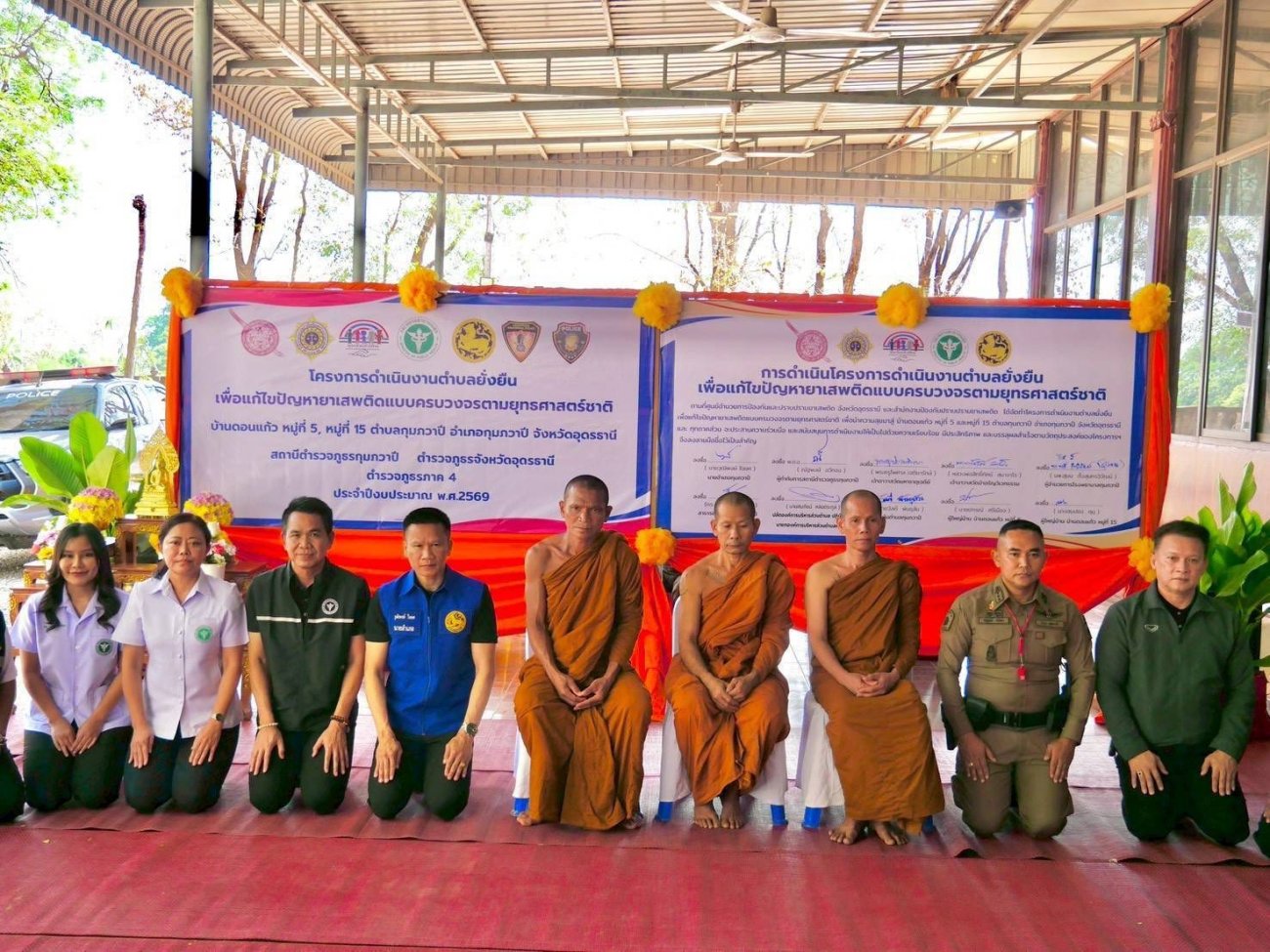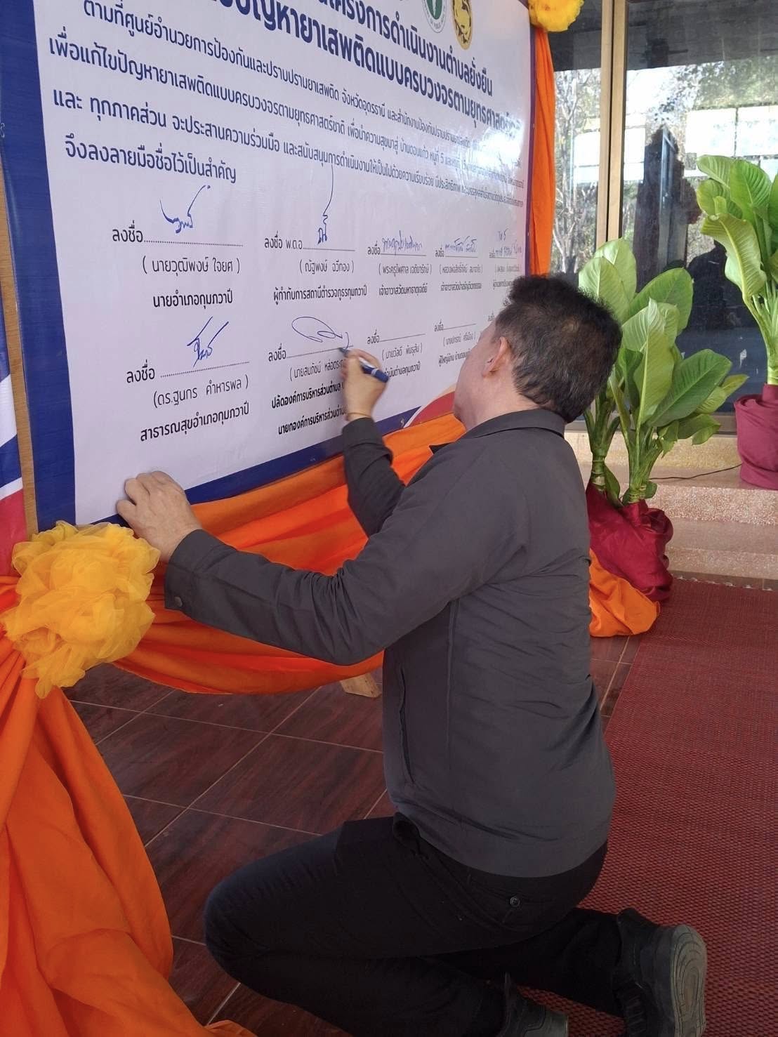 นายวุฒิพงษ์ ใจยศ นายอำเภอกุมภวาปี เป็นประธานในพิธีเปิด “โครงการดำเนินงานตำบลยั่งยืนเพื่อแก้ไขปัญหายาเสพติดแบบครบวงจรตามยุทธศาสตร์ชาติ” โดยมี พ.ต.อ.ณัฐพงษ์ ฉวีทอง ผู้กำกับการสถานีตำรวจภูธรกุมภวาปี นายสมภัชน์ หล่อตระกูล ปลัดองค์การบริหารส่วนตำบล ปฏิบัติหน้าที่ นายกองค์การบริหารส่วนตำบลกุมภวาปี ดร.ฐนกร คำหารพล สาธารณสุขอำเภอกุมภวาปี นายแพทย์หญิงพรดี ชำนิยันต์ รองผู้อำนวยการโรงพยาบาลกุมภวาปี กำนันตำบลกุมภวาปี ผู้ใหญ่บ้านดอนแก้ว หมู่ 5 หมู่ 15 และได้รับความเมตตาจาก พระครูปิยะเจติยาธร เจ้าคณะอำเภอกุมภวาปี(ธ) และ พระพงษ์ สวัสดิ์ ภัทรธัมโม แทนเจ้าอาวาสวัดป่าอรัญวิเวกธรรม ร่วมพิธีลงนาม MOU เพื่อเป็นการบูรณาการ ประสานความร่วมมือ และสนับสนุนการดำเนินงาน